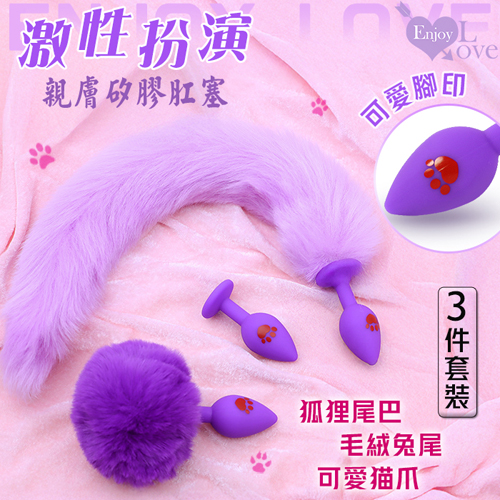 首頁 > SM情趣用品 > 激性裝扮 > Enjoy Love ‧ 激性扮演 ‧ 狐狸尾巴/毛絨兔尾/可愛貓爪腳印親膚矽膠肛塞 3件套裝﹝紫﹞