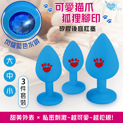 首頁 > 兩性用品 > 後庭塞拉珠-無電動 > Enjoy Love ‧ 可愛貓爪/狐狸腳印~滑順細膩矽膠後庭肛塞【藍肛塞藍亮彩水鑽】大、中、小~3件套裝